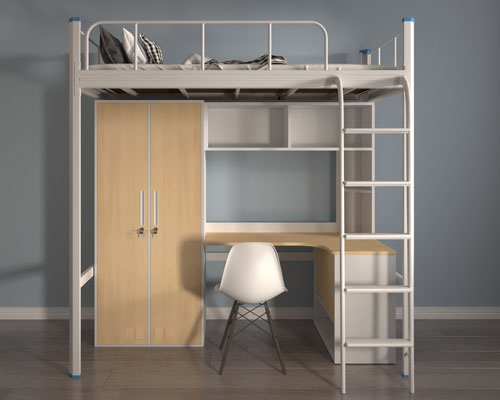 上圖中,所看到的就是一個宿舍里常用的一種鐵床,也叫做公寓床,因為外形酷似一個小公寓一般,所以得此名,它的實用性很強,上鋪可以睡人,下鋪可以給孩子們寫作業,收拾衣物等功能。