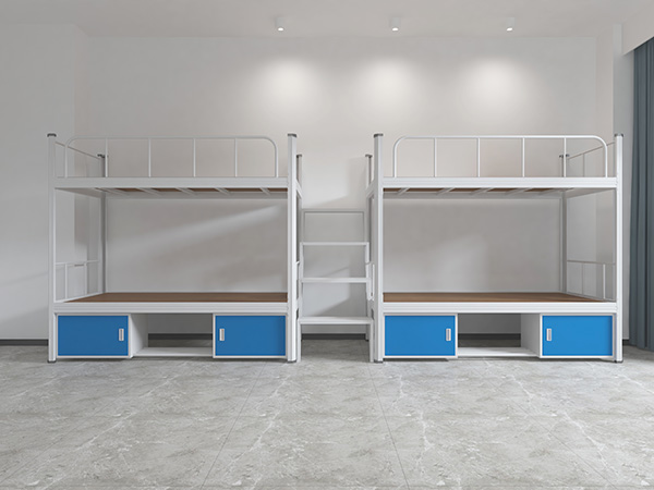圖三中所示為帶床底柜的雙層鐵床,它與上邊幾種宿舍床的區(qū)別就在于多了一個(gè)儲(chǔ)物空間,將原本床底空出來的部分安置上了柜子,這樣無論是行李箱還是衣物,都可以放置其中,另還將原先的爬梯改造成了一個(gè)踏板樓梯,使它的安全性提高了不少。